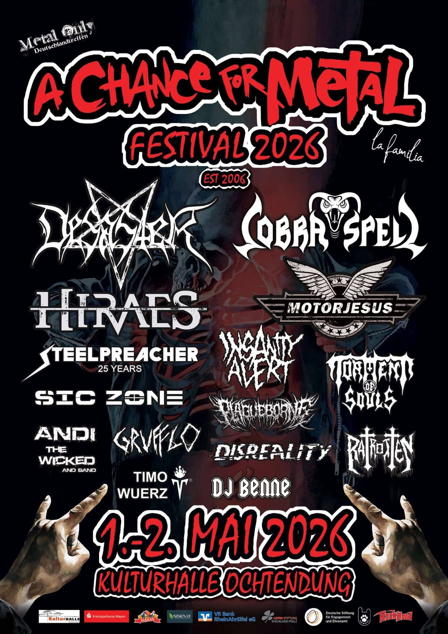 Das A CHANCE FOR METAL FESTIVAL 2025 findet vom 01.05. bis 04.05.2025 in Ochtendung statt! Der...